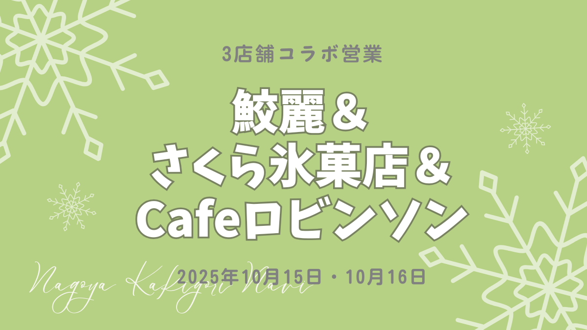 【鮫麗✕さくら氷菓店✕Cafeロビンソン】3店舗コラボ営業 in 鮫麗 イベント情報 2025.10.01 西区の鮫麗さんで、さくら氷菓店さん(茨城)とCafeロビンソンさん(千葉)の3店舗コラボ営業があります。 名古屋からはちょっと遠い人気店のかき氷を味わえる絶好の機会です。 開催概要 日程:2025年10月15日(水)・16日(木) 時間:詳細が分かり次第、記載します 場所:鮫麗(名古屋市西区浮野町9) 地図 公式アカウント 鮫麗(@sameurara) さくら氷菓店(@sakurahyoukaten) Cafeロビンソン(@robinson_yachimata)